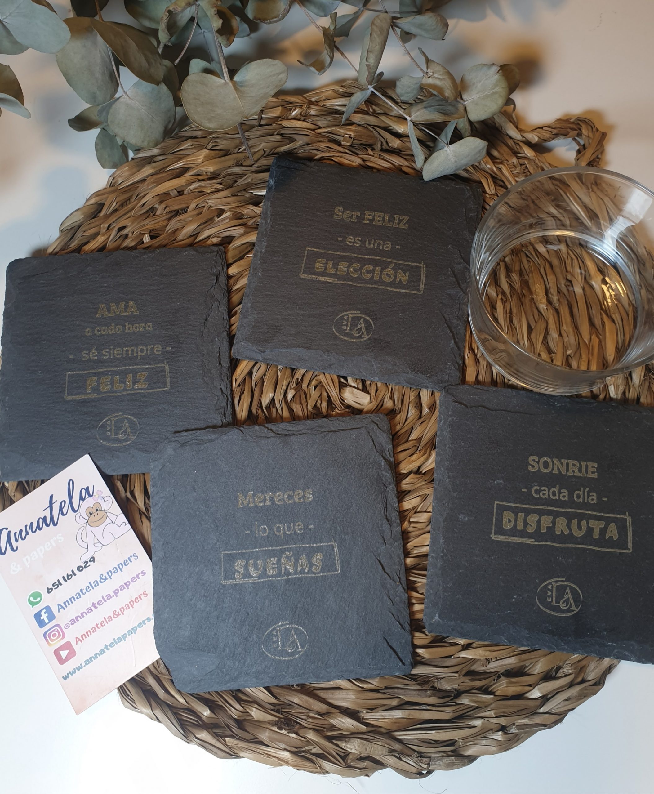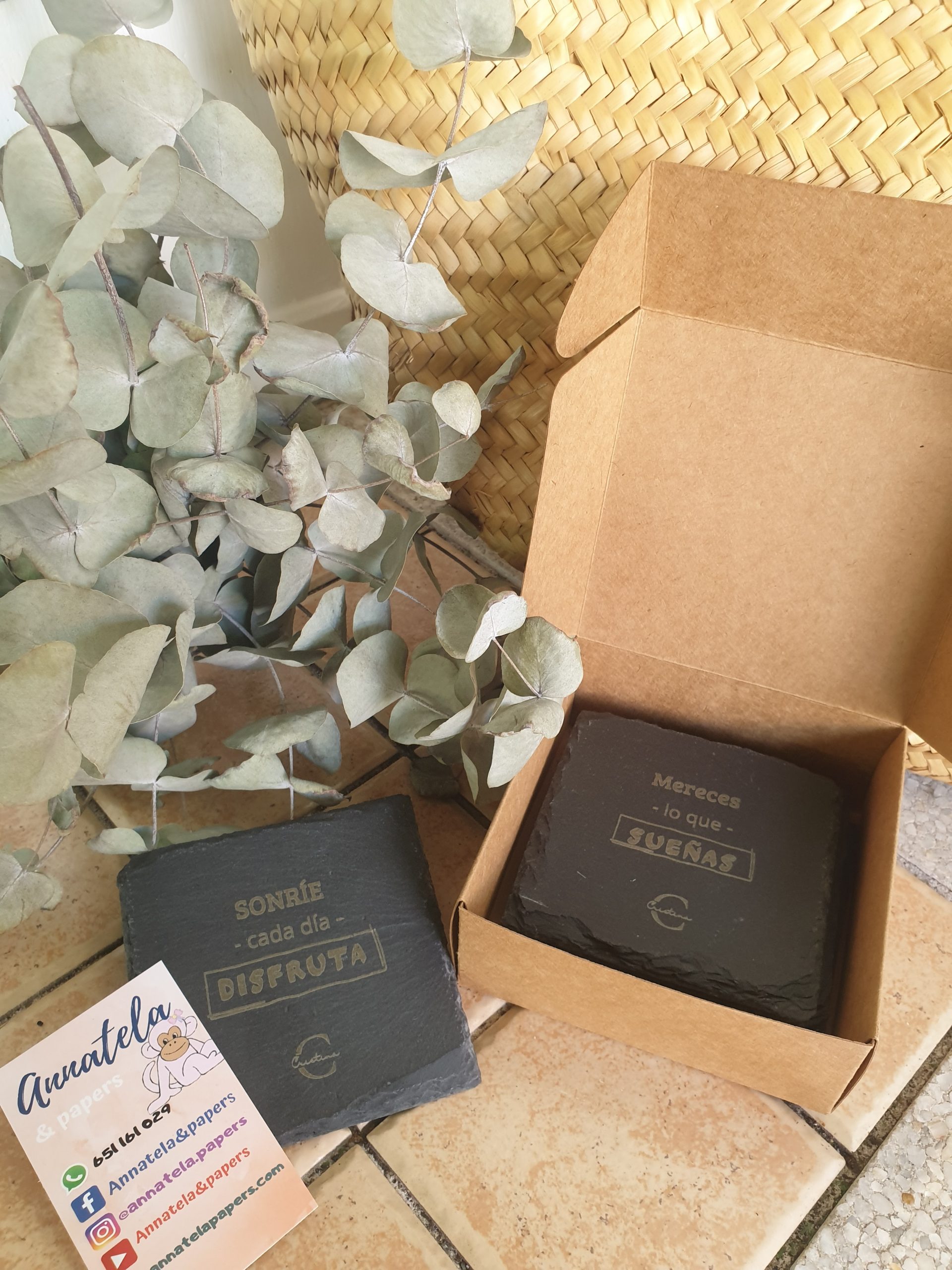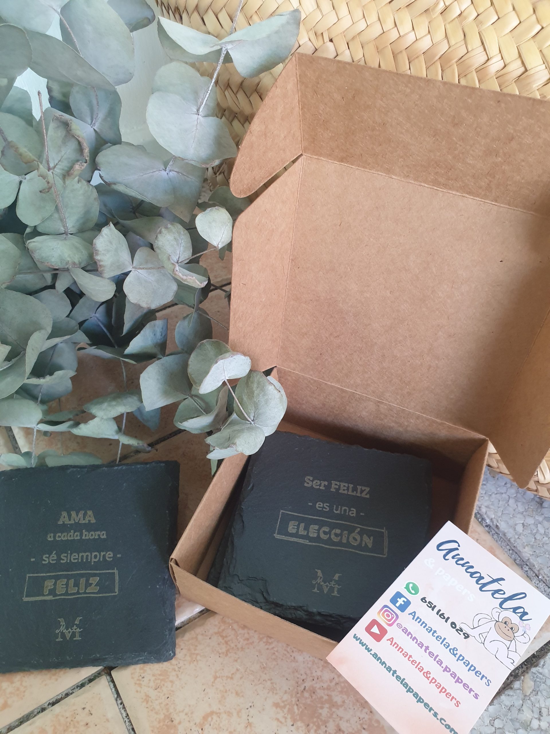 Juego de 2 pizarras, tamaño 10x10cm. Se presentan en cajita personalizada.