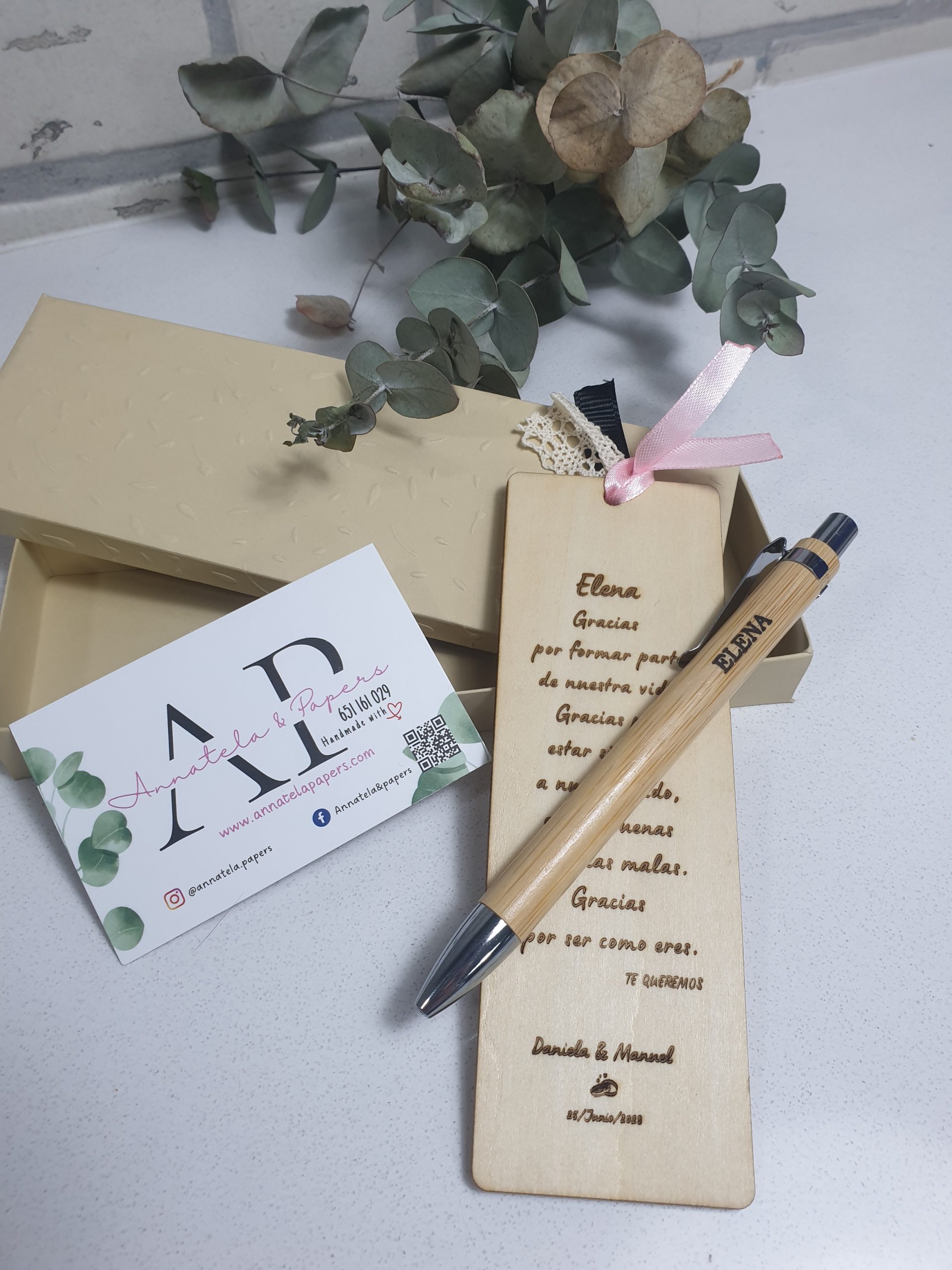 Marcapáginas en madera 15x5x0.3 cm, grabado a laser por ambas caras. Se personaliza el texto.